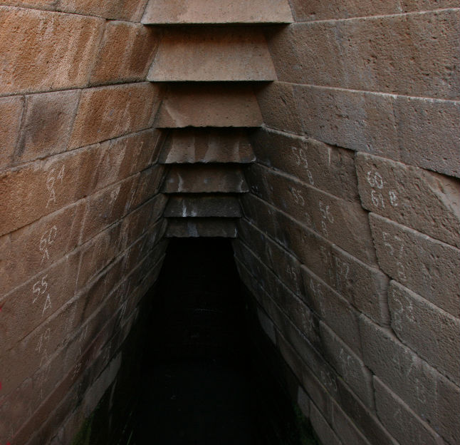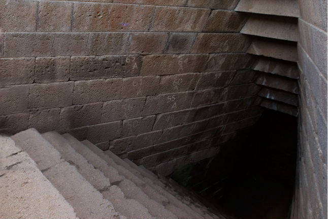 Il vano d'ingresso è un'apertura a ventaglio che introduce in modo solenne alla scala monumentale che entra, composta, nella terra fino ad incontrare le sacre acque sul fondo.
